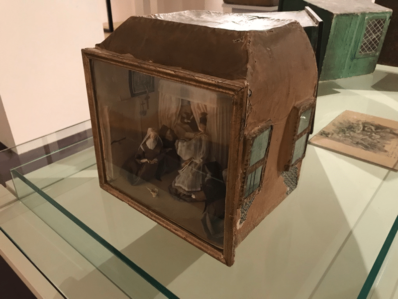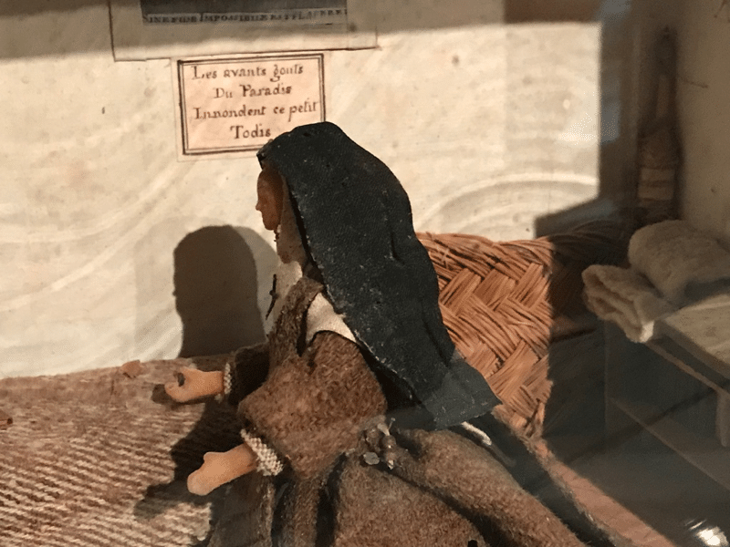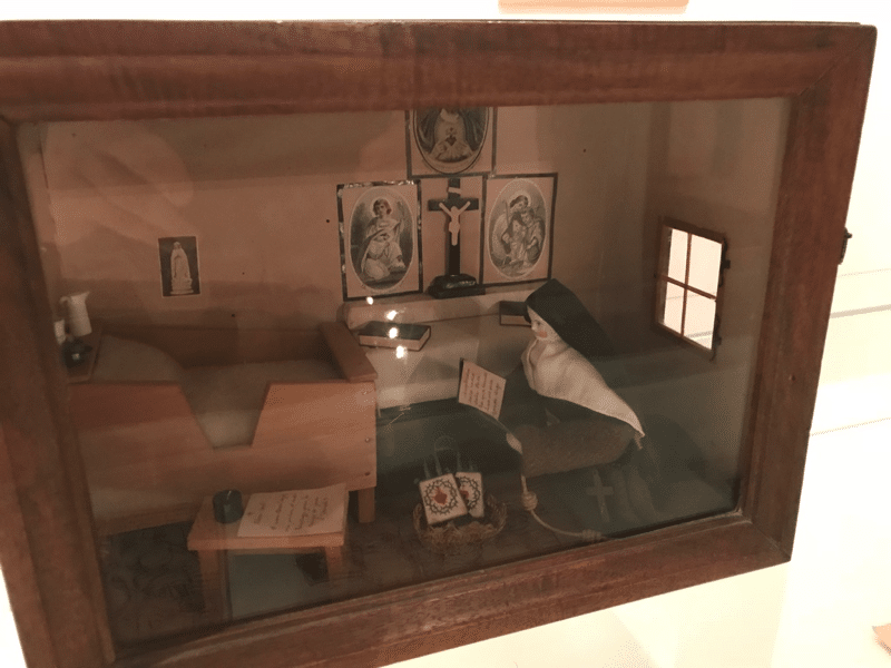 Alors que s’achevait ma visite du musée, j’ai failli manquer l’exposition temporaire, qui s’ouvrait l’après-midi même, mais était par bonheur déjà accessible. Cette exposition temporaire présente les dessins et peintures d’une religieuse parisienne de talent, Geneviève Gallois (1880–1962), mais elle m’a surtout captivé en me permettant de découvrir d’humbles objets que je ne connaissais pas : les boîtes de nonnes, parfois appelées « boîtes de carmélites » (improprement, car elles existent aussi pour d’autres ordres, même si les carmélites sont les religieuses les plus représentées). Dans le Midi, elles sont dénommées béatilles (« beatiho » en provençal). Une exposition consacrée aux boîtes des Carmels de cette région avait d’ailleurs été organisée en 2010 au Museon Arlaten, à Arles, et avait donné lieu à un ouvrage publié par les éditions Actes Sud, en relation avec une création musicale (ce volume est épuisé, mais on peut le trouver d’occasion).