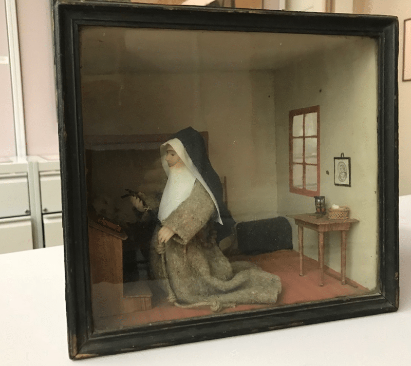 Ainsi, ces boîtes répondent aussi à la fascination pour la vie monastique, à la fois ardue et attrayante aux yeux de ceux qui sont plongés dans l’agitation du monde. Elles permettent un coup d’œil derrière la clôture monastique. À côté de ces caractères spécifiques, c’est la comparaison avec les boîtes de poupées qui vient spontanément à l’esprit du visiteur. Inévitablement, des « cellules de nonnes » ont aussi été parfois utilisées comme jouets par des enfants et ont donc été abîmées. Nombre d’entre elles ont sans doute été détruites, avant que des musées et des amateurs éclairés prennent conscience de l’intérêt et de la valeur artistique de ces humbles et touchants témoignages sur les vies consacrées.