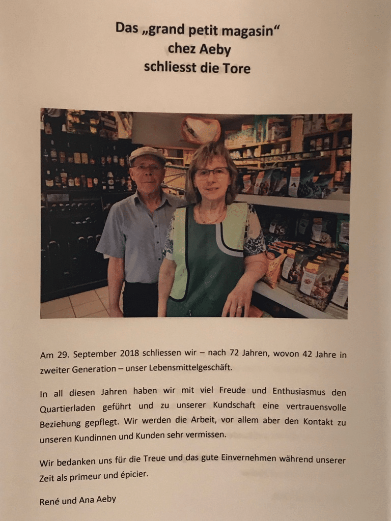 Jusqu’à présent toujours remplis de marchandises soigneusement rangées et attendant les clients, les rayons commencent à se dégarnir. Un petit pincement au cœur pour le visiteur, qui devine les sentiments du maître des lieux : celui-ci a passé toute sa vie dans cet environnement, depuis son enfance. Cela faisait 72 ans que cette épicerie pimpante derrière sa vitrine bien entretenue faisait partie du décor de la ville de Fribourg, à l’ombre de la cathédrale. Elle était tenue depuis 42 ans par la seconde génération de commerçants, rappelle une affichette dans la vitrine. Mais elle va connaître le destin de tant de petits commerces avant elle : à la fin du mois de septembre, le magasin Chez Aeby fermera ses portes.