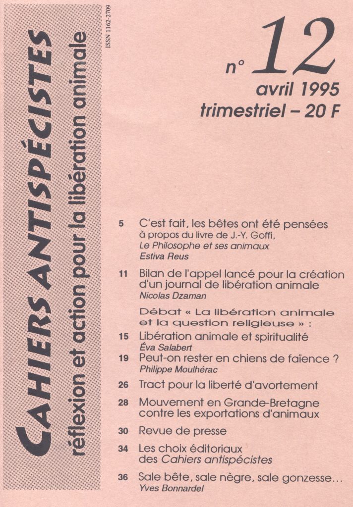 Les antispécistes dont j’avais découvert les publications dans les années 1990 n’inclinaient guère vers la religion. Cela ne signifie pas qu’ils ne s’y intéressaient pas : en avril 1995, le N° 12 des Cahiers antispécistes contenait un débat sur « La libération animale et la question religieuse ». Ce débat faisait suite à la lecture du livre d’Eugen Drewerman, De l’immortalité des animaux (Paris, Cerf, 1992).