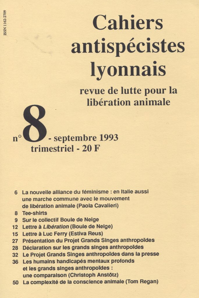 Le mot de « spécisme » (speciesism) aurait été forgé en 1970 par Richard Ryder pour qualifier la discrimination contre des espèces animales au nom d’une supposée supériorité de l’espèce humaine [2]. Dans les années 1990, j’avais découvert l’existence des Cahiers antispécistes lyonnais : je ne me souviens plus si mon attention avait été attirée par une affichette sur un mur lors d’un passage à Lyon ou par une mention dans un périodique. Je m’étais abonné durant quelque temps à ces Cahiers (qui avaient renoncé dès 1994 à l’adjectif « lyonnais »). Ils me firent découvrir quelques aspects d’un courant dont j’ignorais tout, dont la démarche pour l’égalité animale était clairement ancrée dans une culture politique libertaire[3], ou plus largement « progressiste »[4]. Cette littérature me permit notamment de rencontrer pour la première fois les noms (et les textes solidement construits) de David Olivier (né en 1956)[5] et d’Yves Bonnardel (né en 1967). Les travaux du philosophe australien Peter Singer (né en 1946) — dont le rôle dans la diffusion du concept de « spécisme » a été crucial — représentaient une référence intellectuelle importante : la traduction française de son influent livre sur La Libération animale (1975) avait été publiée en 1993 chez Grasset.