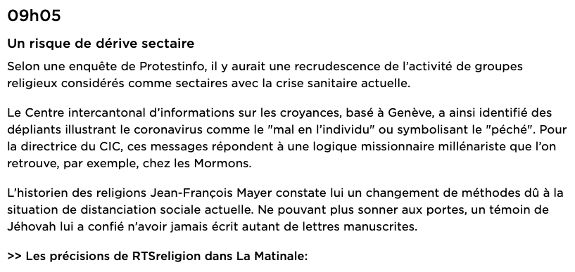 Au lendemain de la publication de l’article, j’en ai découvert un résumé sur le site de Radio Télévision Suisse, sous le titre « Un risque de dérive sectaire ». Je reproduis ce texte ci-dessous. Le texte incluait un lien vers une chronique de RTSreligion résumant l’article. Mes propos sont cités correctement, mais le lecteur rapide va avant tout se souvenir d’une chose : il y a des risques de dérives sectaires liés à la situation de pandémie, on cite les mormons et les Témoins de Jéhovah, et cela semble appuyé par les propos de Jean-François Mayer, alors que je parle uniquement d’adaptation des méthodes et nullement de « dérives sectaires ».